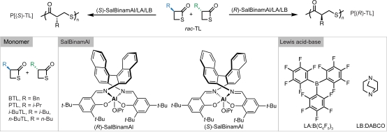 针对如上挑战,朱剑波教授团队在前期的外消旋四元环内硫酯动力学拆分聚合工作基础上(Angew. Chem. Int. Ed. 2024, 63, e202405382)通过利用市售的路易斯酸碱催化剂(B(C6F5)3/DABCO)发展了一种新型“Lewis acid/base-SalBinamAl”催化体系,该催化体系成功实现首例动态动力学拆分开环聚合反应,利用该策略实现了外消旋四元环内硫酯的动态动力学拆分聚合,以大于96%的产率合成了手性的聚硫酯。该工作将为手性聚合物的合成提供新的研究思路。