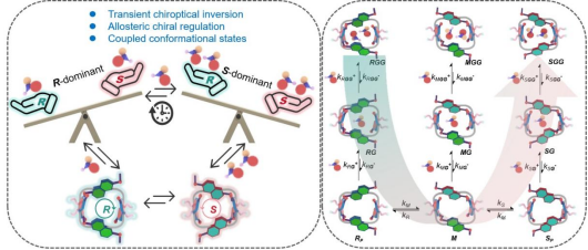 近日,杨成/伍晚花团队和李坤团队合作,合成了一类新型甘脲-萘基杂化大环(NGU [n,n]),其中 NGU[2,2] 具备可互变的 RP、SP 构型及内消旋构型,其平衡可被氨基酸衍生物的逐步结合扰动,形成的 1:1 和 1:2 主客体复合物会触发独特圆二色(CD)响应,第二次结合还能实现手性偏好反转,达成主客体体系中前所未有的手性变构调控,而时间分辨 CD 测试更捕捉到信号翻转等瞬态反转现象,内消旋构型在此过程中发挥关键作用,这一发现不仅是首个表现出时间分辨手性光学反转的主客体络合体系,更为超分子聚合之外的路径复杂性研究提供了全新思路。这意味着,未来我们有可能设计出能够在特定时间点响应特定刺激的分子材料,能够根据输入顺序做出不同输出的分子逻辑元件,甚至能够模拟生物系统中复杂信号处理模式的人工化学神经元。